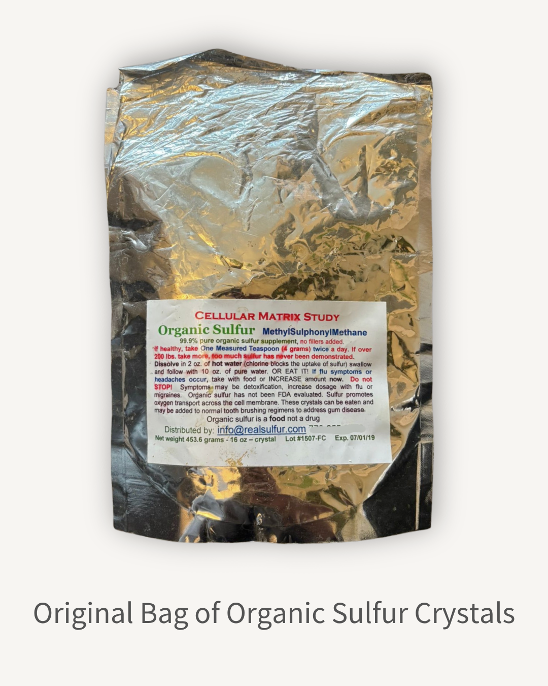 More than a decade ago, our founder was introduced to Pure Organic Sulfur Crystals by Patrick McGean, known as the "Godfather of Organic Sulfur Crystals." Patrick initiated the original Cellular Matrix Study that began in 1999.